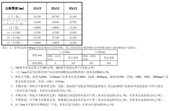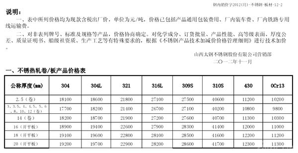 太钢不锈2012年12月份不锈钢热轧产品出厂价
