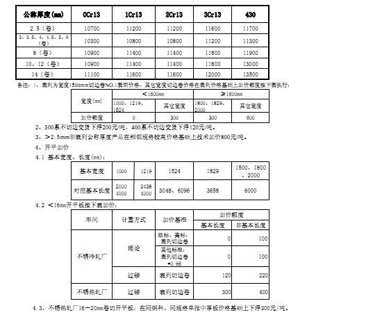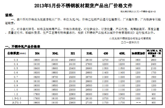 根据目前不锈钢市场行情,结合我公司生产经营情况,经研究决定,制定对不锈钢经销协议户2013年5月份不锈钢板材期货产品出厂价格如下: