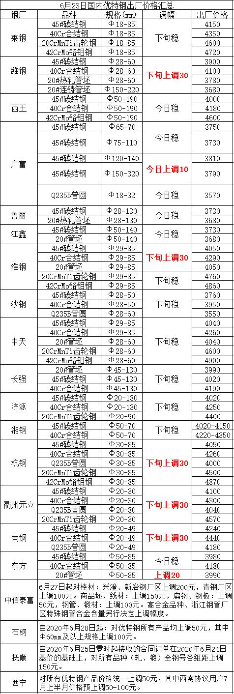 6月23日国内优特钢出厂价格汇总(中信泰富等上调50-200)