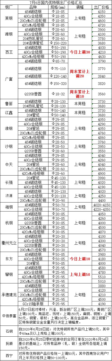 7月6日国内优特钢出厂价格汇总(部分上调10-30)