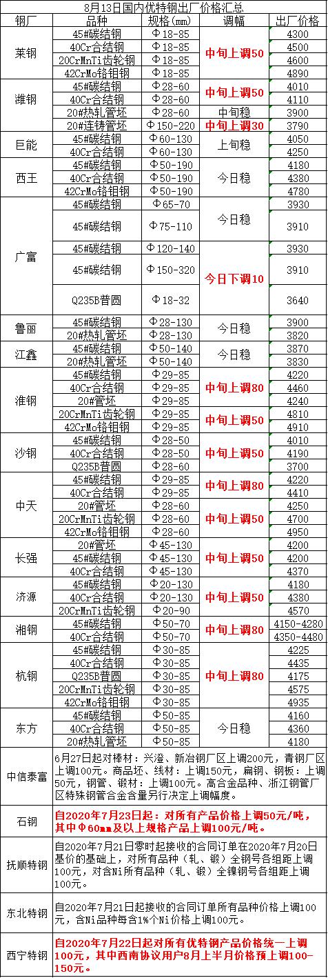 8月13日国内优特钢出厂价格汇总(部分下调10)