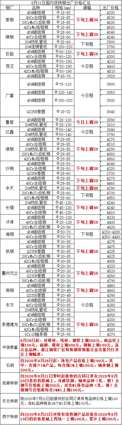 8月21日国内优特钢出厂价格汇总(普遍上调30-50)