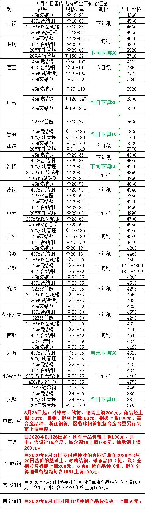 9月21日国内优特钢出厂价格汇总(部分下调50-80)
