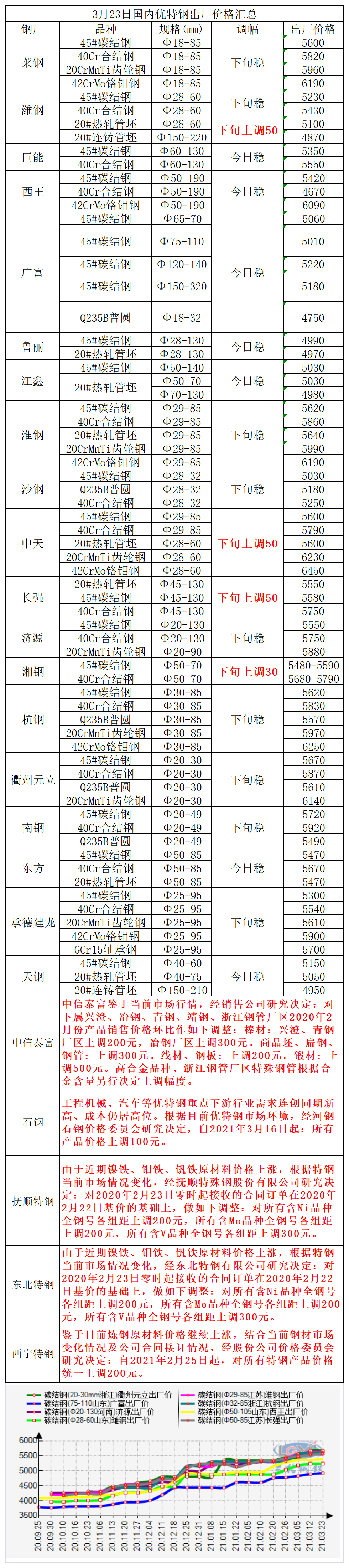 3月22日国内优特钢出厂价格汇总(今日部分上调20-60)