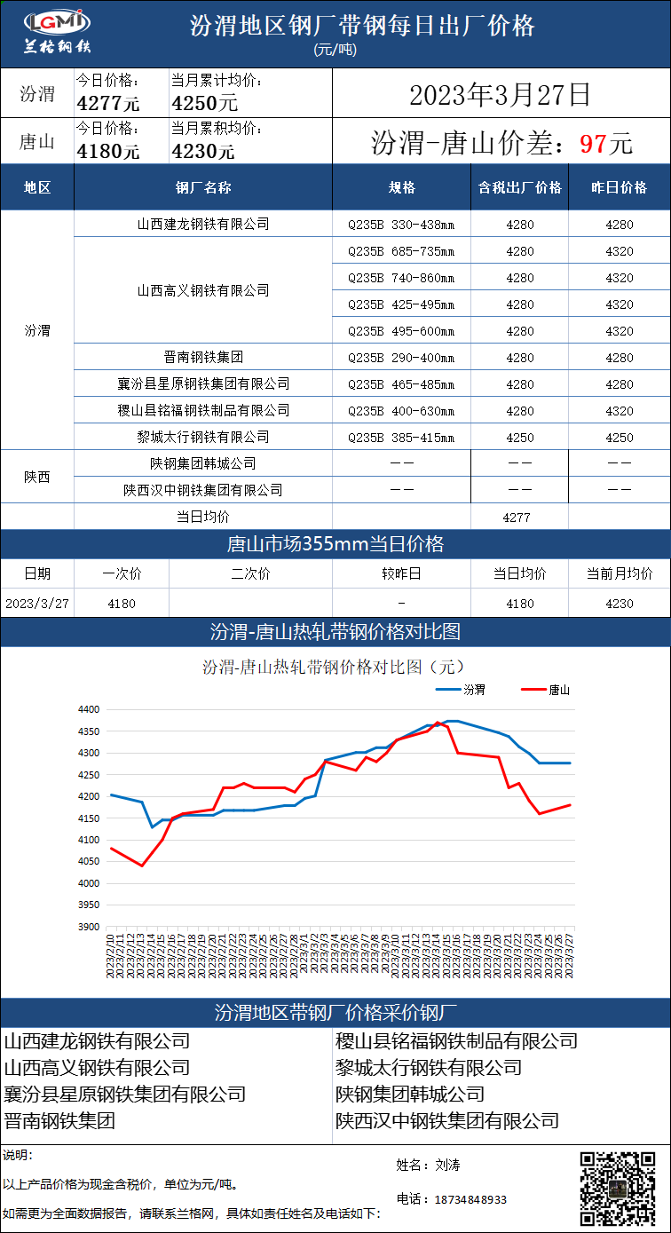• 3月27日汾渭地区钢厂带钢出厂价格