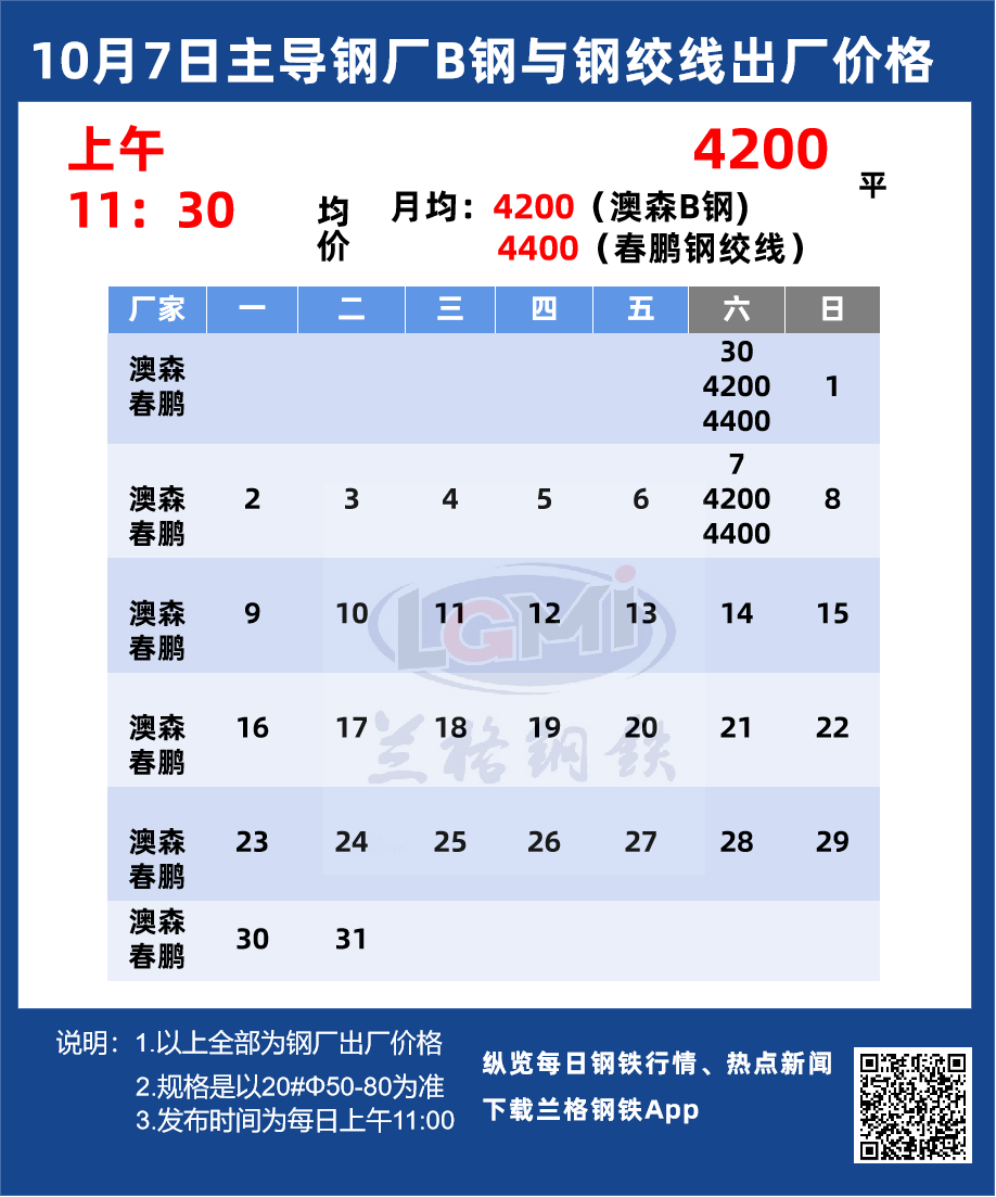 10月7日主导钢厂B钢与钢绞线出厂价格汇总