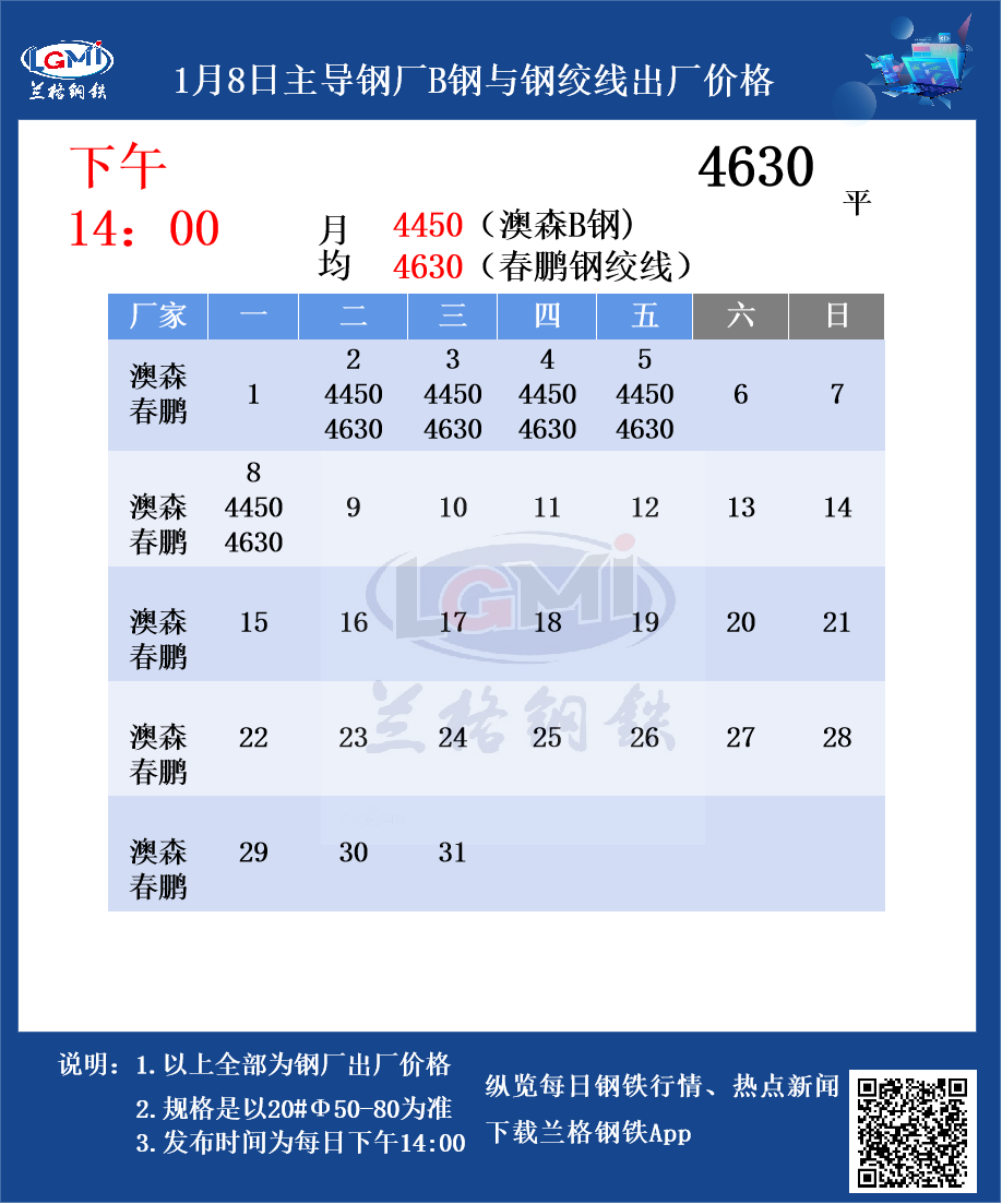 • 1月4日主导钢厂B钢与钢绞线出厂价格